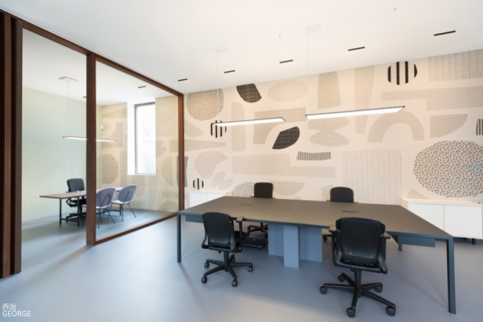 小型會議室主要是為了外來訪客或者是公司部門之間使用的,所以在裝修的時候要精致一些。地面使用的是和會客廳一樣的地毯,墻面同樣也是使用米黃色的墻紙。吊頂使用的是集成吊頂加平板燈。布藝窗簾上面全部都印有公司的LOGO。多方位展現公司的文化。