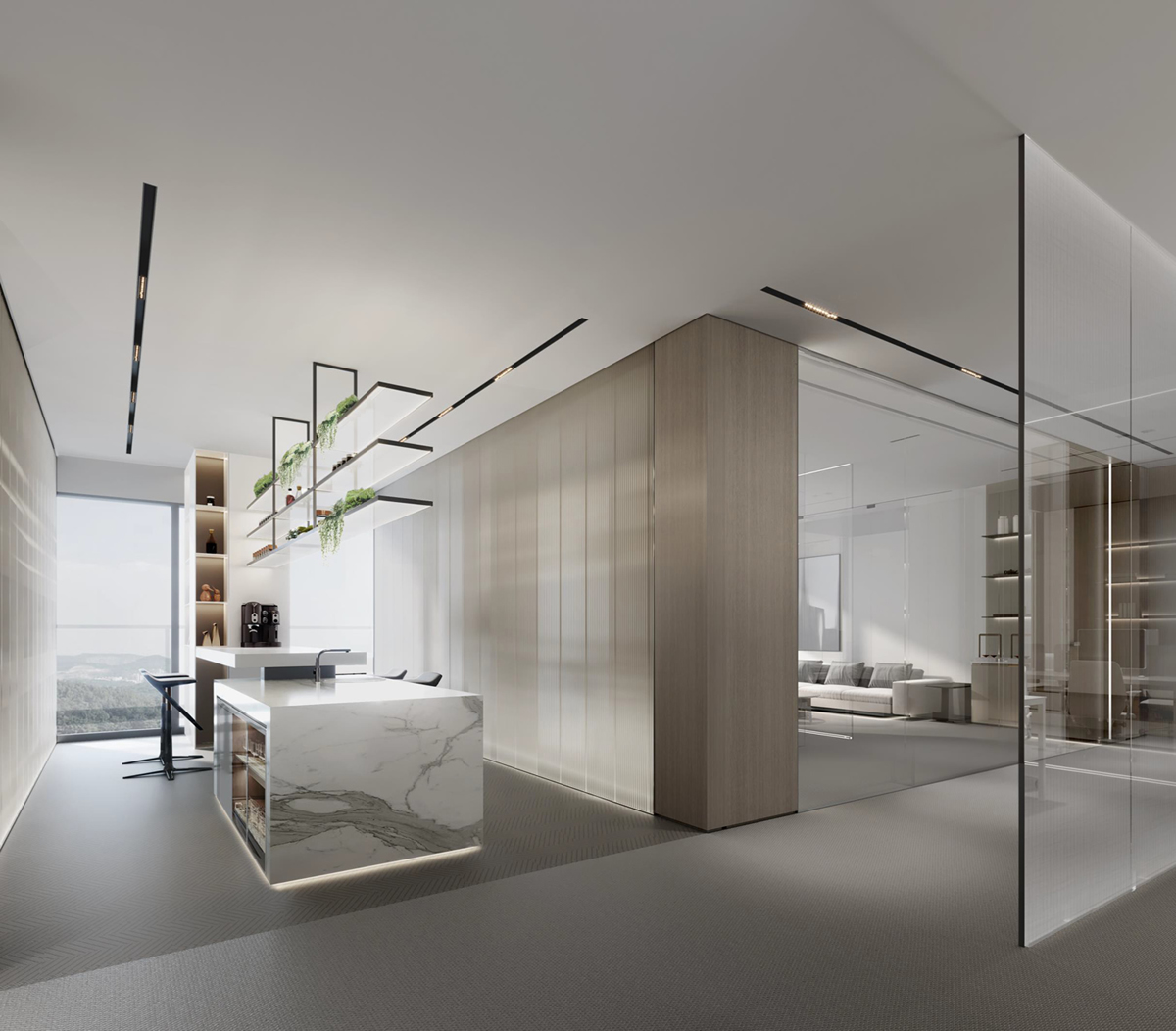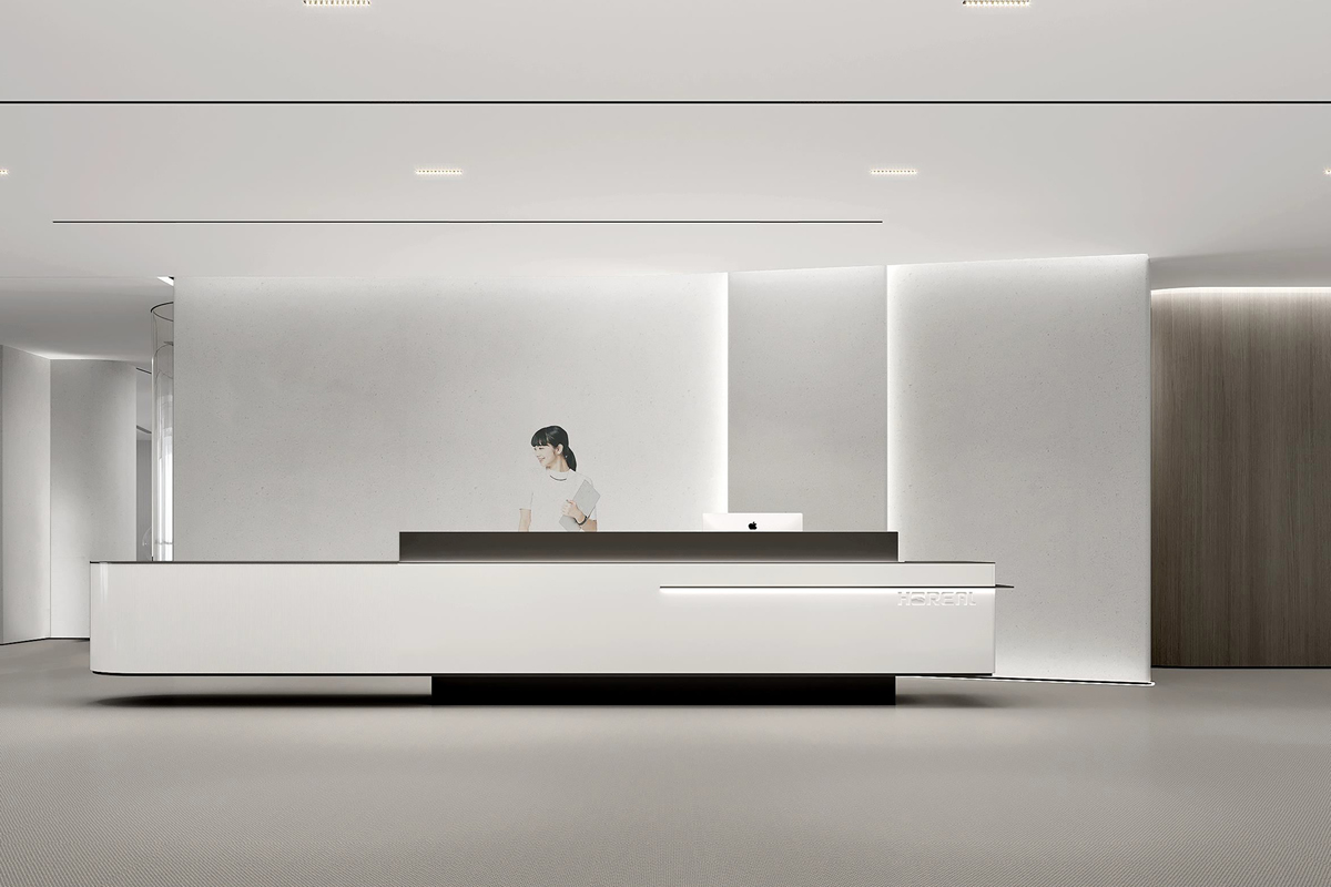 簡潔的線條、人性化的細節,材質和造型上尋求創新,讓極簡也能生動,耐人尋味。極簡,從另一個角度看,也是一種極奢,讓前臺空間簡約整潔含蓄優雅,這也體現著公司優雅的品位審美與思想文化。