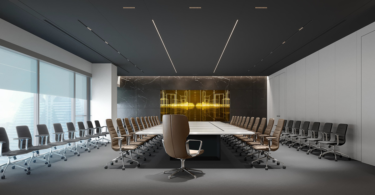 會議室色彩設計一般有主調來體現氣氛,主調的選擇應能反應空間主題并考慮色彩的施色部位及其比例分配,作為主色調,一般應占有較大比例,而次色調作為與主調相協調的用色,只占小的比例,有跳色的作用,本案中灰色為主色調,加入棕色后,沉悶的空間出現靈動的感覺。