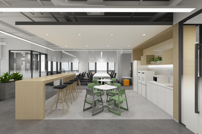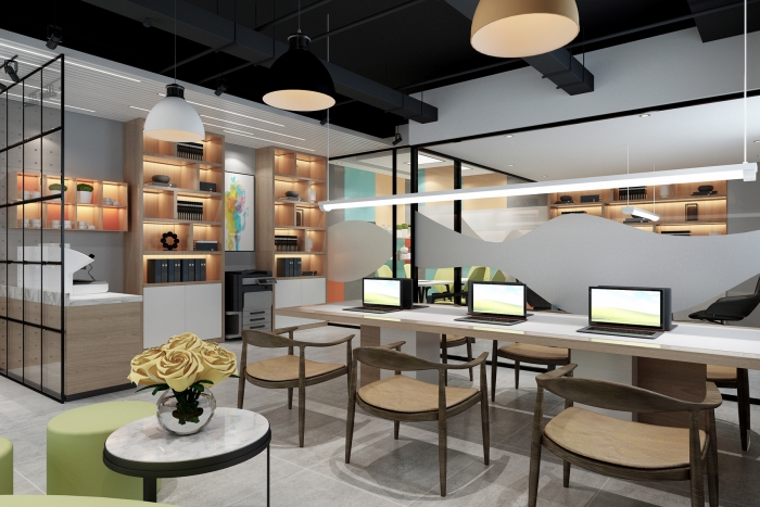 該案例總面積達到7000平,設計風格定位為現代簡約型。簡約風格這幾年逐漸成為辦公室裝修的主流。它注重線條簡潔、色調溫和,給人帶來簡單、舒適、自然、高品質的感覺。工作臺和柜子的采用簡潔設計,用統一的顏色調和它們之間的關系。此外,設置一些以木質為基礎的裝飾品來提升整體感受。